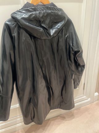 Trenca de charol con capucha. - Cierre de botones a presión. - Dos bolsillos delanteros con solapa. - Cordones ajustables en la capucha.