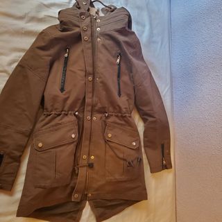Chaquetón largo con capucha y multiples bolsillos. Cierre con corchetes y cremallera. Ajuste con cordones en cintura y cuello. Talla M. Muy cuidado.