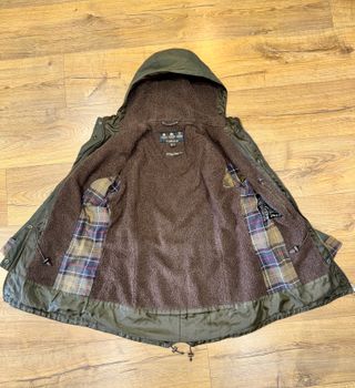 Parka encerada estilo militar Barbour en verde oliva con forro interior de borrego marron y detalles de cuadros escoceses (tartan). - Modelo talla M (38 EU) mujer entallado en cintura. - Capucha ajustable. - Bolsillos frontales con solapa y cremalleras. - Cierre de cremallera y botones, ajuste cintura. - Puños y bajo con estampado de cuadros. - Detalle de bandera Union Jack en bolsillo lateral. - Modelo SMU Winter Force Parka (edicion exclusiva). - Es un modelo de invierno bastante cálido, mas grueso que las clasicas Bedale o Beadnell. - MUY BUEN ESTADO. Encerado muy bien conservado, sin grietas, roturas, manchas o descosidos.