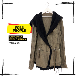 Chaqueta estilo parka de Free People, talla XS, en color verde caqui con capucha grande y forro interior tipo borreguito en negro. Diseño entallado con cordones ajustables en la cintura y bolsillos frontales, muy cómoda y abrigada para otoño e invierno. Bajo y puños con acabado deshilachado intencionado, de estilo boho/desgastado; perfecto para looks casual con vaqueros y botas. Tejido exterior de algodón con dibujo espiga, interior suave y cálido; se cierra con botón y cinturón/cordones cruzados. En buen estado general, con el desgaste propio del estilo de la prenda y sin rotos funcionales.