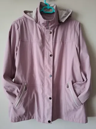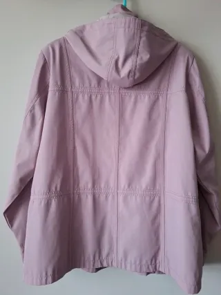 Axilas 65 cm Hombros 45 cm Largo 75 cm Parka impermeable, rosa palo y detalles en beige. Apenas utilizada. Impecable. Cierre con cremalleras y clips rápidos. 2 bolsos parte inferior. Capucha desmontable. Arma muy bien porque lleva finas hombreras. Muy estilosa. Solo le falta el cinturón que nunca se usó.
