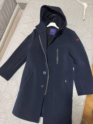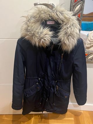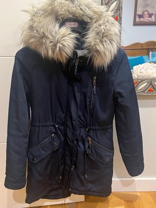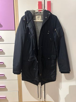 Parka de la marca Green Coast en color azul marino, con capucha y forro interior de borreguito. Talla S.