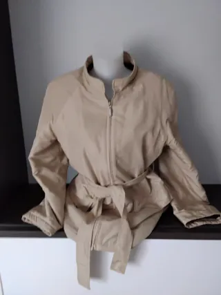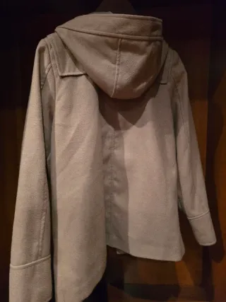 Abrigo tipo trenca en color beige. Tiene una talla 42. En buen estado general. Tiene una mancha de grasa en una manga (ver foto), no ha salido con agua y jabón. El resto del abrigo está bien, es calentito y cómodo. Precio ajustado por la mancha y por mudanza.