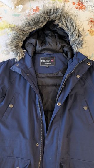 Parka de invierno para niños de la marca Trollkids. Es una prenda resistente y cálida. Talla 152 - Capucha con pelo sintético. - Cierre de cremallera. - Bolsillos frontales con solapa. - Puños ajustables.