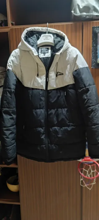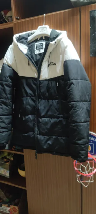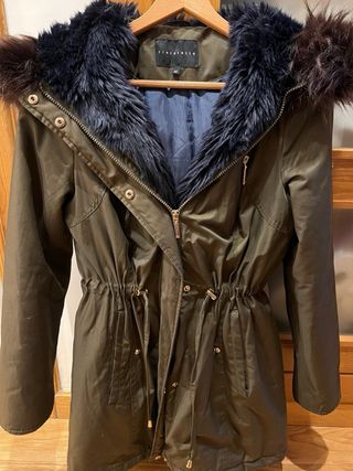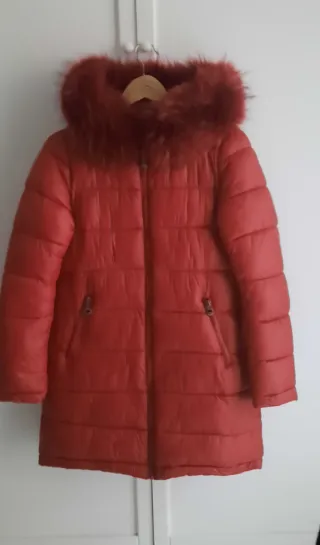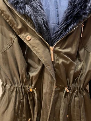 Parka de invierno con un diseño moderno y cálido. Puesta un par de veces. Me queda un poco justa. - Capucha con detalle de pelo sintético.El pelo se puede quitar,va con botones. - Cierre frontal con cremallera y clip - Bolsillos delanteros con solapa. - Cordón ajustable en la cintura.