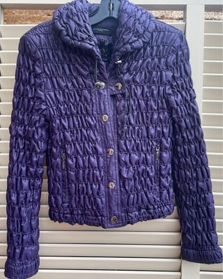 Elegante parka de la marca Simorra con un diseño fruncido muy original. - Color morado vibrante. - Cierre de botones. - Bolsillos con cremallera.