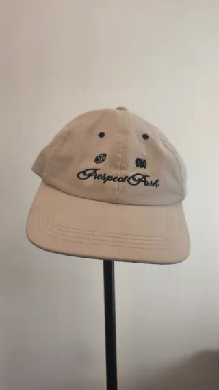 Gorra de estilo urbano en color beige con bordado. - Diseño con texto Prospect Park y detalles gráficos. - Visera con costuras. - Cierre ajustable.