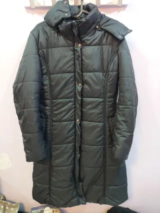 Abrigo largo tipo parka para mujer. Diseño acolchado y cuello alto. - Cierre de cremallera y botones. - Bolsillos laterales. - Capucha integrada. Abrigo chubasquero en perfecto estado. Todos los cierres y cremalleras en perfecto estado.