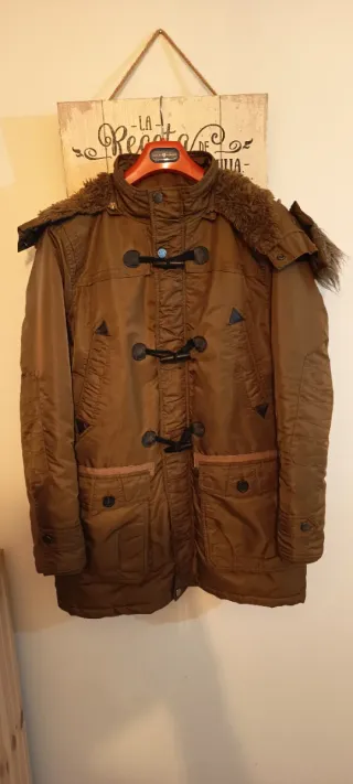 Parka de hombre con un diseño moderno y detalles cuidados. Perfecta para el día a día. - Capucha con pelo sintético. - Cierre de cremallera y botones. - Bolsillos frontales con solapa. Parka de hombre. Talla 50, M. Muy cómoda y abrigada. Tiene un poco de desgaste en las presillas de los botones. Ver foto. Negociable