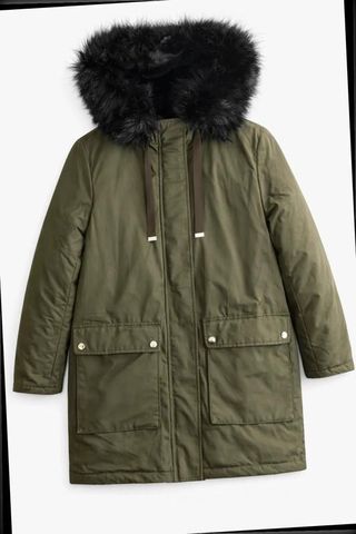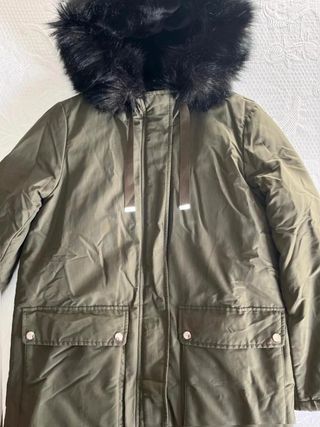 Parka Zara verde kaki con capucha y pelo negro...