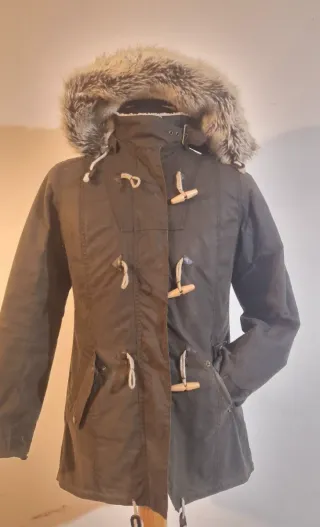 Parka de la marca Pull&Bear, ideal para el frío. - Forro interior de borreguito desmontable. - Capucha con pelo. - Cierre de cremallera y botones. - Bolsillos exteriores.