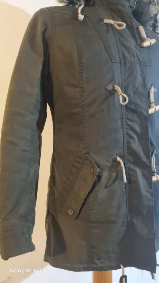 Parka de mujer en color verde militar, talla S. Muy poco uso. - Capucha forrada de borreguito. - Cierre de cremallera. - Cintura ajustable con cordón. - Bolsillos frontales con solapa. - Bolsillos laterales con cremallera.