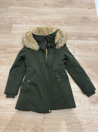 Abrigo de estilo parka con capucha y detalles de pelo. Talla s m - Color verde militar. - Forro interior de borreguito. - Puños de punto. - Cordones ajustables en la cintura.
