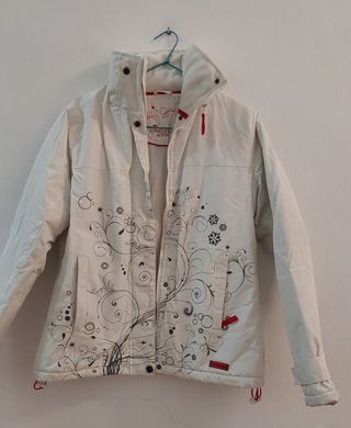 Anorak abrigado con bolsillos y capucha, ideal para la nieve, en blanco roto, con un fino dibujo.