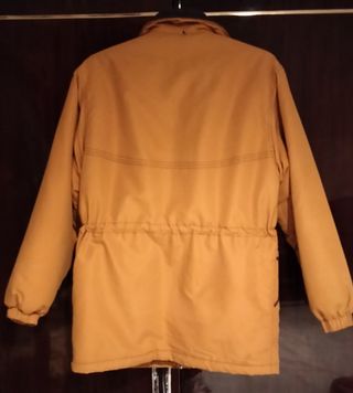 Cazadora color mostaza con ribetes azul marino y cordón a la cintura. Cazadora fuerte de abrigo. Casi nueva