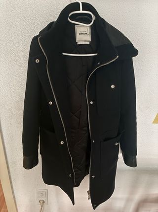 Abrigo tipo parka con interior de borreguito extraíble. Como nuevo, muy poco uso. - Capucha con detalle de pelo (extraíble). - Cierre con cremallera y botones. - Cintura ajustable con cordón. - Bolsillos delanteros con solapa.