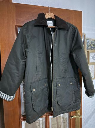 Abrigo tipo parka encerada de Zara en color negro. Un básico versátil para cualquier armario. - Cierre de cremallera. - Bolsillos frontales con solapa. - Cordón ajustable en la cintura. - Cuello alto con botones. Gorro incluido de quita y pon. Está perfecto, no tiene ningún roce ni nada.