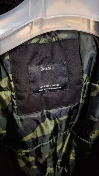 Parka de la marca Bershka en talla M. Pero puede ser para una talla L perfectamente. Cuenta con un forro interior de camuflaje y capucha con pelo que se puede quitar mediante cremallera - Cierre principal con cremallera y botones. - Bolsillos frontales con solapa. - Puños ajustables.