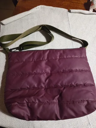 Bolso bandolera acolchado de color granate. Cuenta con una correa ajustable de color verde. - Diseño acolchado. - Correa de hombro ajustable. - Cierre con cremallera. - Forrado precioso.