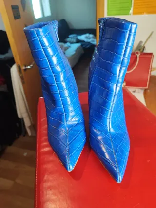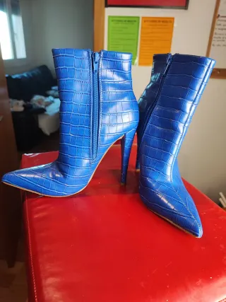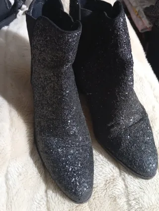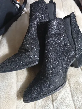 Botines de fiesta con un diseño llamativo y elegante. Algo desgaste zona interior apenas se nota. - Acabado brillante con detalles plateados. - Diseño tipo chelsea con elástico lateral. - Tacón cuadrado para mayor comodidad.