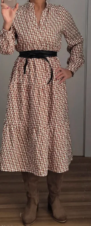 Vestido largo con un bonito estampado. - Diseño con cuello mao y manga larga. - Falda con mucho vuelo. - Comodísimo.