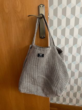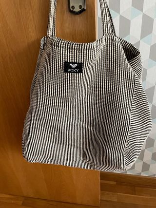 Bolso tote de la marca Roxy con un diseño de rayas verticales. - Diseño de rayas verticales. - Etiqueta de la marca Roxy con corazón.