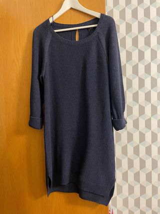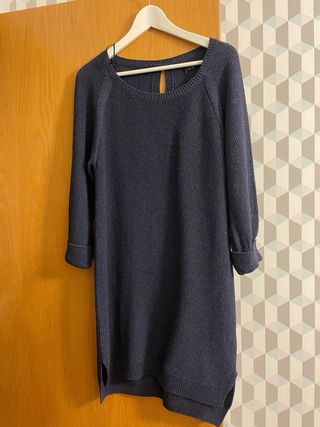 Vestido de punto de manga 3/4 con un diseño moderno. - Tejido de punto texturizado. - Corte recto. - Aberturas laterales en el bajo. - Detalle de abertura en la espalda. - Azul marino - Composición en fotos
