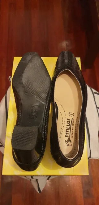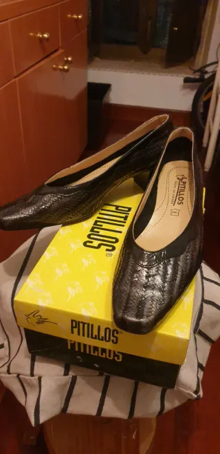 Elegantes zapatos de la marca Pitillos. - Talla 40. - Color negro. - Diseño con textura. - Tacón medio. - Te llevas 2 por el precio de 1 - Tiene echa una cuña en el zapato izquierdo haciendo el exterior,,los 2 pares