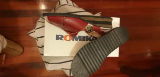 Sandalias de mujer de la marca Romika en color rojo. - Diseño cruzado en la pala. - Cierre con hebilla. - Tira trasera ajustable. - se regala otro par de zapatos con cuña