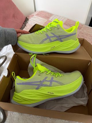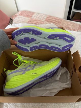 Zapatillas de running llamativos tonos verde neón y morado. Diseñadas para ofrecer comodidad y rendimiento en cada carrera. - Parte superior de malla transpirable. - Detalle de franjas laterales. - Suela con tecnología FF Turbo.