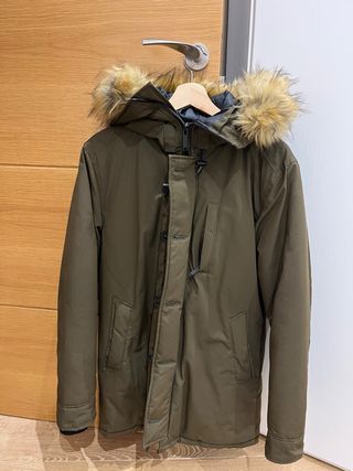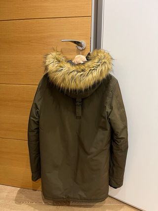 Abrigo de invierno de Zara en color verde, con capucha y detalle de pelo. - Cierre de cremallera y botones. - Bolsillos frontales. - Forro interior.