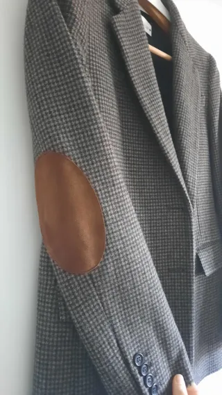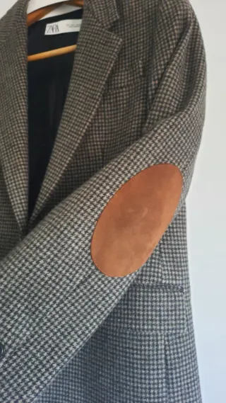Elegante blazer de Zara con un clásico estampado de cuadros. - Tejido de lana. - Detalles de parches en los codos. - Diseño cruzado.