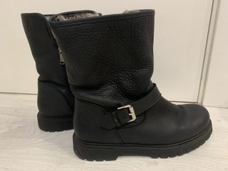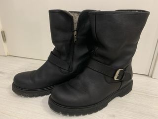 Botas de media caña con un diseño moderno y cálido. - Exterior de piel texturizada. - Forro interior de pelo suave. - Correa con hebilla metálica. - Cierre de cremallera lateral. - Ningún rasguño ni tara. - Muy poco usada. - Son muy cómodas. - Precio en tienda 199€.