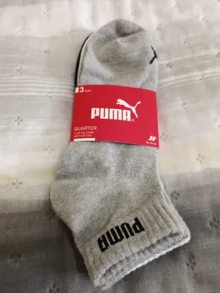 Pack de tres pares de calcetines Puma. - Modelo Quarter. - Costuras planas en la puntera. - Suaves y cómodos. - Talla EU 43-46. Dispongo de Dos packs. Si te llevas los Dos packs los dejaría por 10 euros Están nuevos,Conservan sus precintos