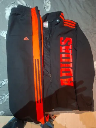 Conjunto deportivo Adidas de dos piezas. - Chaqueta negra con detalles naranjas. - Pantalón negro con panel lateral naranja. Vale más o menos para una talla de 1,65 a 1,75 de altura y de peso de 65 a 80 kilos