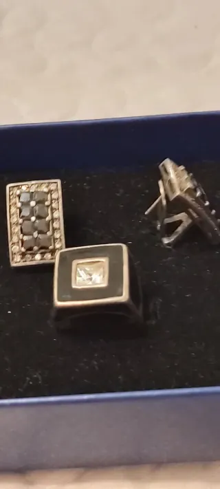 Este conjunto de joyería incluye varias piezas con un diseño elegante. - Anillo con piedra cuadrada central y borde negro. - Pendientes con piedras negras y circonitas,cierre omega.