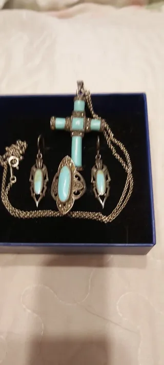 Elegante conjunto de bisutería con un diseño clásico. - Incluye un colgante con forma de cruz. - Dos pendientes a juego. - Un anillo con una piedra central ovalada. - Cadena de plata con cierre de mosquetón.