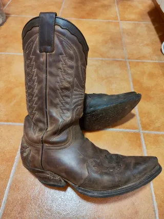 Botas originales Sendra de cuero marrón, talla 42. Un clásico del estilo western. - Diseño con costuras decorativas. - Puntera cuadrada. - Tacón de bloque.