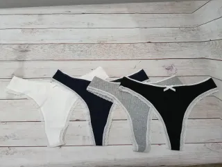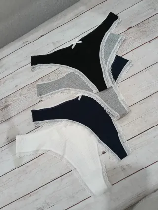 Pack de cuatro tanguitas de mujer con detalles de encaje y lazo. - Diseño de corte - Tejido suave y cómodo. - Acabado con puntilla de encaje. - Pequeño lazo decorativo en la parte delantera.