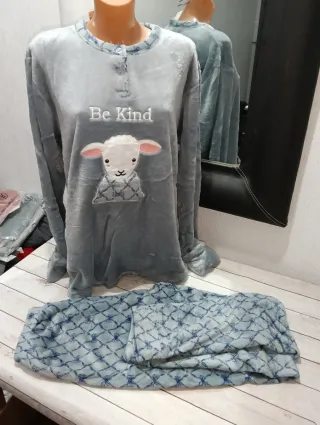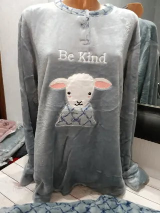 Conjunto de pijama de tacto muy suave y cálido, ideal para estar cómodo en casa. - Diseño con estampado de oveja y mensaje Be Kind. - Cuello redondo con botones. - Manga larga. - Tejido de peluche. - Pantalón a juego con estampado.