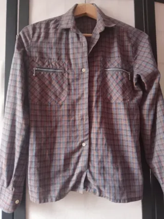 Camisa de manga larga con un diseño a cuadros en tonos marrones y grises. Presenta dos bolsillos en el pecho con cremallera. - Cuello camisero. - Cierre de botones. - Puños abotonados.