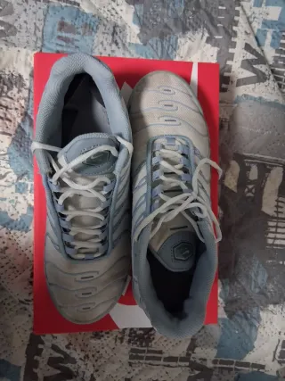 Zapatillas deportivas Nike Air Max TN con un diseño moderno y deportivo. - Combinación de colores azul y plateado. - Detalle de swoosh en azul. - Suela con tecnología de amortiguación visible.