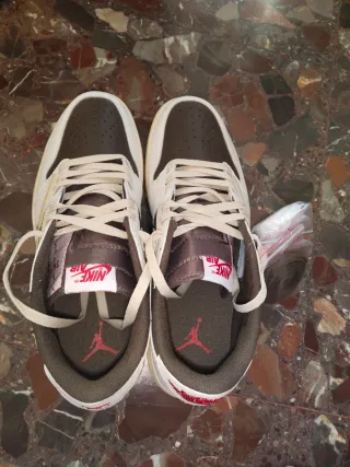 Zapatillas Jordan 1 x Travis Scott. Las vendo nuevas a estrenar en su caja, y con sus respectivos cordones en color beige, aparte vienen unos rojos, blancos y marrones. - Diseño icónico con detalles en marrón y blanco. - Cordones de color claro.