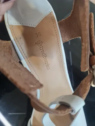 Sandalias de cuña con tiras en color blanco y marrón. Talla 38 Muy nueva El único detalhe es una diminuto desperfecto en la punta de uno de los pies. (Ver en foto) por lo demás están impecables. - Diseño de cuña con acabado imitación madera. - Tira frontal en blanco. - Tira de tobillo en marrón con hebilla metálica.