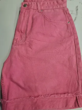 Shorts vaqueros de color rosa. Talla 42 Usado - Cintura alta. - Bolsillos delanteros y traseros. - Bajo deshilachado.