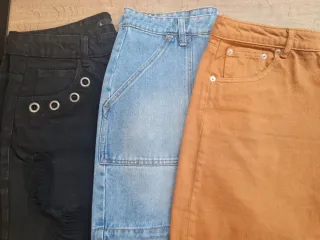 Lote de tres minifaldas en talla L (40). ♦️Todas muy nueva, con poquísimo uso - Falda negra con rotos y ojales. - Falda vaquera azul con bolsillos. - Falda color caramelo.(marrón) .