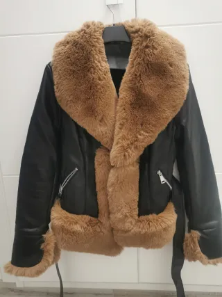 Chaqueta con detalles de cuero y pelo sintético. - Diseño moderno y elegante. - Combinación de texturas para un look único.