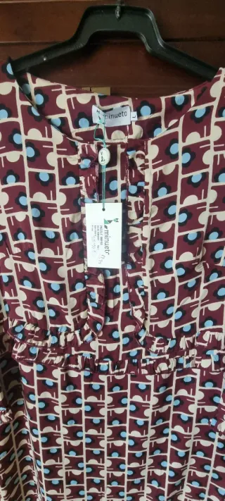 Vestido de la marca Minueto, ideal para primavera/otoño, con estampado geométrico. - Diseño con cuello redondo y volantes en el pecho. - Mangas largas con detalle de volante. - Cintura elástica con volantito y fruncido. - Largo a la rodilla. Precio: Hazme tu oferta y llegamos a un acuerdo. En mi perfil tengo más prendas de ésta y otras marcas españolas que te pueden interesar y hacer un lote 😉