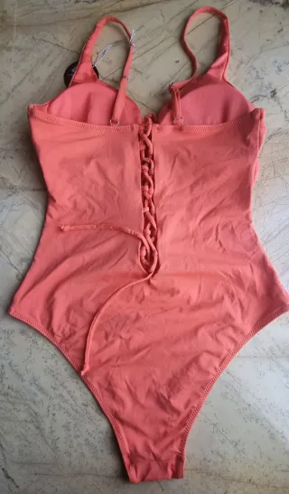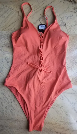 Bañador de una pieza para mujer en color calabaza, con cordón delantero y trasero. - Escote en V con detalle de cordones. - Tirantes finos ajustables. - Pecho con relleno. - Toda la pieza lleva forro interior del mismo tejido y en el mismo color. - Cuerpo Efecto reductor y pecho efecto push up. - Talla 46.