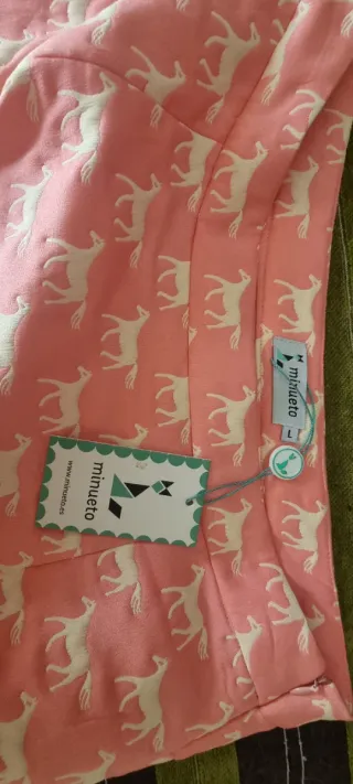 Falda acampanada con un bonito estampado de caballos blancos sobre fondo rosa. Largo a la rodilla. Cierre cremallera oculta lateral. Forro interior en el mismo tono rosa. El tejido es grueso, con mucho cuerpo. Queda preciosa puesta. Talla L.